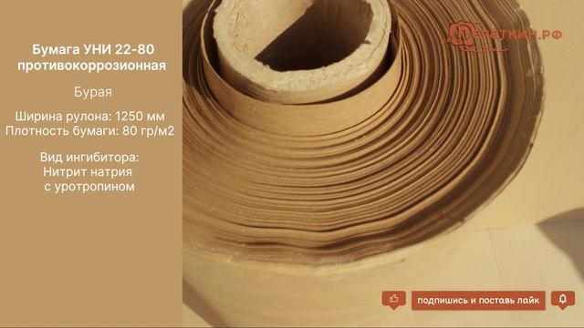 Бумага предназначена для защиты металлоизделий, изготовленных из чёрных металлов, от атмосферной коррозии. Ширина рулона 1250 мм. Подробное описание и цены на нашем сайте: http://www.pechatkin.org/bumaga/yni.html Доставка по всей России.