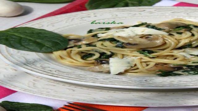 Спагетти в сливочном соусе с шампиньонами, шпинатом и горгонзолой
