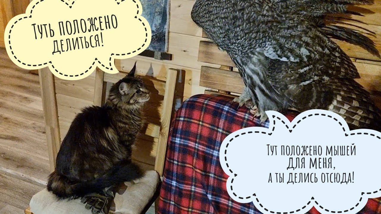 Кошка Морошка не ест мышей. Но если у совы неясыти Кофи что-то есть, то и кошке это что-то очень нужно! Сова против и не желает, чтобы кошка нарушала совиную зону комфорта.