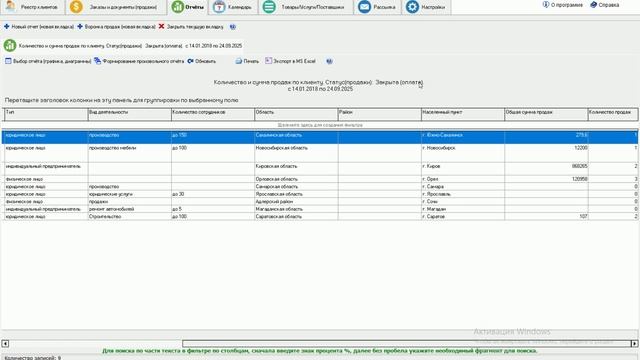 "Клиент Плюс" - удобная и простая программа для работы с клиентами и управлению продажами. Использование программы позволит вести реестр (базу) клиентов с подробной информацией, фиксировать все отношения с клиентами, строить полезные отчёты и формировать реестры продаж (заявок и заказов). Также Вы сможете быстро формировать документы по продажам вести удобный календарь напоминаний. Бесплатная версия на сайте https://clientplus.ru/ Программа "Клиент Плюс" позволяет хранить подробные сведения по всем заявкам и продажам. Для качественного контроля и анализа работы по клиентам и учету продаж рекомендуется сохранять информацию по всем запросам от клиентов, как текущих так и потенциальных. Например, это могут быть проявления первой заинтересованности потенциального заказчика, которые можно фиксировать в программу как "заявка" со статусом "интерес". Вторым примером можно рассмотреть случай, когда уже работавший с Вами клиент повторно вернулся к Вам с очередным заказом документов на оплату. Данный запрос можно зафиксировать как продажу со статусом "открыто". О том как вносить сведения по заказам и заявкам есть отдельный видео-урок. По мере исполнения заказа с Вашей стороны и оплат со стороны заказчика будет меняться "статус заказа". Важно сохранять не только заявки, где заказчик уже принял решение о сотрудничестве с Вами и запросил документы. Необходимо сохранять заявки даже с предварительной заинтересованностью, которые не переходят в стадию фактической продажи. Хранение всех запросов и заявок позволит формировать полезные отчеты по ним и видеть эффективность работы с клиентами и результативность обработки их запросов. Программа "Клиент Плюс" позволяет формировать полезный отчет по итоговой сумме и количеству заказов от клиента за период времени-. Данный отчет строится на основании внесенных сведений по всем запросам от потенциальных и текущих клиентов-. Для формирования отчета необходимо перейти в модуль "Отчеты". Далее нажать кнопку "Новый отчет". Откроется раздел для выбора способа построения отчета. Нажмите кнопку "выбор отчета -(графика, диаграммы)". Откроется форма для выбора отчетов. Выделите категорию отчета "клиенты". После чего выберите вид отчета "количество и сумма продаж по клиенту". При необходимости определите период--или оставьте пустые даты, чтобы построить отчет за всё время. Далее выберите нужный "статус" заявок и заказов-, по которым формировать отчет. В данном примере построим отчеты по закрытым продажам, то есть по которым проведены все оплаты и отгружены товары или оказаны услуги в полной мере. Далее нажмите кнопку "Выполнить". Сформируется отчет, который построчно покажет каждого клиента, внесенного в программу и следующие итоговые столбцы: 1.Общая сумма продаж со статусом "закрыто". Как было сказано ранее, статус "закрытая продажа" включает заказы, по которым сделаны оплаты и отгружены товары или оказаны услуги в полной мере. 2. Второй итоговый столбец показывает общее количество заказов от клиента. При клике левой кнопкой мыши на заголовок столбца "общая сумма продаж" таблица сортируется по данному столбцу. В данном примере видно, что максимальная сумма "закрытых продаж" была с индивидуальным предпринимателем Савельевой Ларисой. А по четырем клиентам не было ни одного завершенного заказа. Если кликнуть по заг