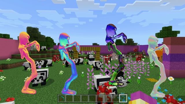 alien dances. pink aliens, transparent aliens, green aliens and negative aliens in Minecraft world