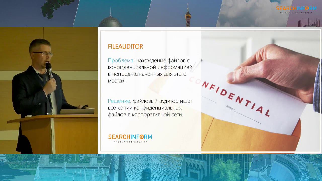 Евгений Матюшенок, директор по продажам в РФ и СНГ: 1. Стратегия развития систем безопасности: комплексный подход. 2. Новые функции в ведущих ИБ-продуктах: сканирование облаков, блокировки, контентные маршруты и др. 3. Новые продукты за 2019 год: FileAuditor, Database Monitor. Наши продукты: «СёрчИнформ КИБ» - защита от утечек информации https://bit.ly/2RfQmeN. «СёрчИнформ ProfileCenter» - классификация характеристик личности https://bit.ly/2YdMf4z. «СёрчИнформ FileAuditor» - аудит файловой системы https://bit.ly/2rOBaLe. «СёрчИнформ SIEM» - обработка потока событий https://bit.ly/2Rf58CB.
