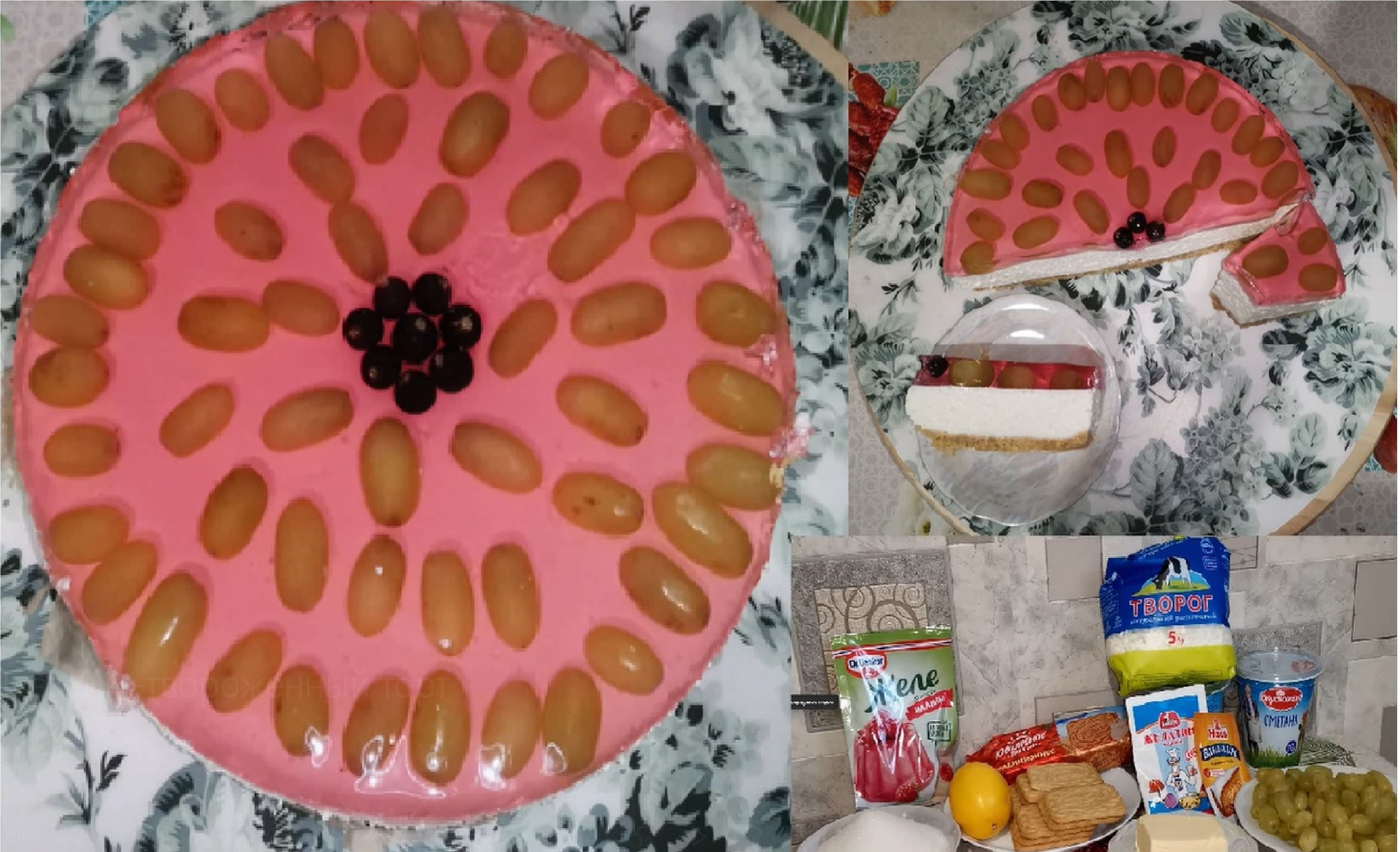 Чизкейк - творожный десерт без выпечки. Его еще можно назвать тортом, или пирогом, или десертом. Приготовление чизкейка занимает не много времени, а в результате у вас получится довольно вкусное лакомство с гладкой текстурой и хрустящей основой, достойный самых высоких похвал. А со свежими ягодами и фруктами сочетается изумительно. ИНГРЕДИЕНТЫ. Для песочной основы: песочное печенье- 220 гр.; сливочное масло- 150 гр.; Для крема: творог - 350 гр.; сметана- 500 гр.; сахар - 150 гр.; лимон - 1 шт.; ванильный сахар- 1 пачка; желатин- 10 гр.; виноград для украшения; смородина для украшения; желе малиновое – 2 пачки (90 гр.).