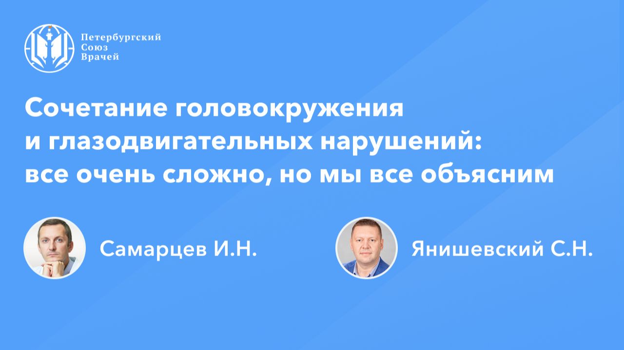 Сочетание головокружения и глазодвигательных нарушений: все очень сложно, но мы все объясним Дата проведения: 13.11.2025, 20:00 Страница мероприятия: https://spb.doctor/i/251113/ Программа: 1. Сочетание головокружения и глазодвигательных нарушений: все очень сложно, но мы все объясним Самарцев Игорь Николаевич 2. Абортивная терапия мигрени: нюансы лечения вестибулярных расстройств Самарцев Игорь Николаевич 3. Ответы на вопросы О семинаре: Головокружение вместе с глазодвигательными нарушениями (двоение в глазах, нистагм, ограничение движений глазных яблок и др.) часто указывает на сочетание вестибулярной и нейроофтальмологической патологии. В онлайн-семинаре будет рассмотрен комплексный подход к диагностике и ведению таких пациентов, включая дифференциальную диагностику периферических и центральных причин, алгоритмы обследования, а также принципы мультидисциплинарного взаимодействия.