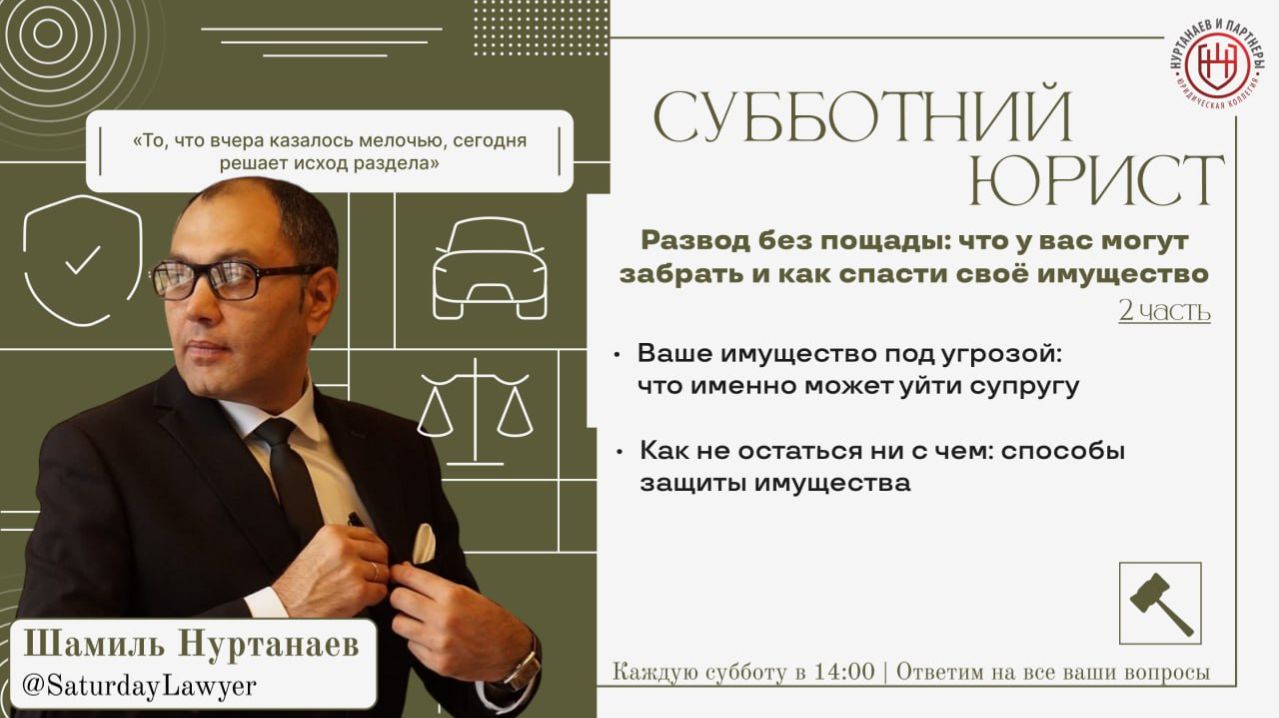 Об этом и о многих других вопросах мы поговорим завтра 6 декабря на очередной трансляции "Субботнего Юриста" (https://t.me/SaturdayLawyer) ⚖️ Эфир проведет юрист с более, чем 20 летней практикой – Шамиль Нуртанаев (https://nurtanaev.ru/shamil-ramazanovich-nurtanaev/) (нажав на имя вы можете узнать о юристе больше). Тема эфира: «Битва за активы» 📝 Вот основные вопросы, которые мы обсудим в эфире: 1. Ваше имущество под угрозой: что именно может уйти супругу? 2. Как не остаться ни с чем: способы защиты имущества? Также, каждый может задать свой вопрос любым удобным для вас способом, перейдя по ссылке: https://clck.ru/3ByDxh Или же просто напишите вопрос в комментариях к посту Получите юридическую консультацию, не выходя из дома! 🎥 Записи эфиров на нашем Rutube: https://rutube.ru/channel/40148985/ VK Видео: https://vk.com/video/@vk.nurtanaev Дзен: https://clck.ru/3DQGpA ⚡️⚡️⚡️⚡️Трансляция пройдет на платформе VK Видео и Rutube, по ссылкам ниже👇 ✅ Присоединяйтесь к эфиру 6 декабря 2025 года в 14:00, будет интересно: https://vkvideo.ru/@vk.nurtanaev - VK Видео https://rutube.ru/channel/40148985/ - Rutube