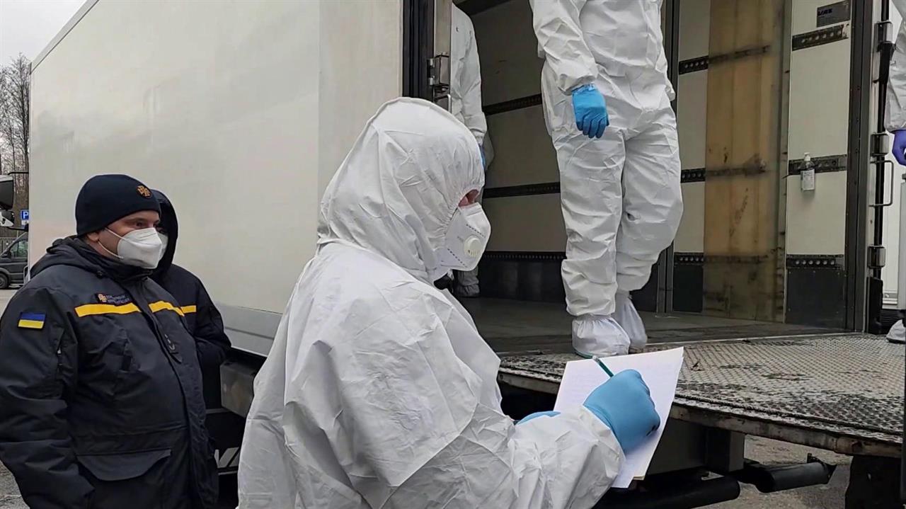 Наша страна передала Украине 1000 тел солдат ВСУ. Одновременно с той стороны мы забрали 30 наших погибших бойцов. На кадрах видно несколько машин МЧС, люди в защитной белой спецодежде.