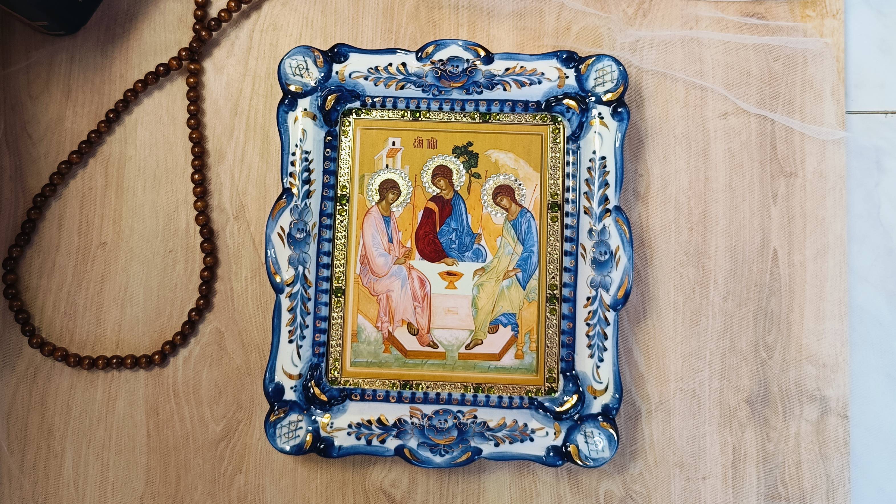 Икона со стразами Swarovski Троица, гжельский фарфор