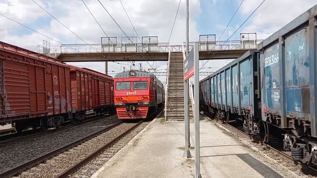 Электропоезд ЭТ2М-083 с пригородным поездом №6606/№6605 Екатеринбург Пассажирский - Нижняя прибывает на 2-й путь Ст. Храмцовская, Свердловская обл., СВЖД