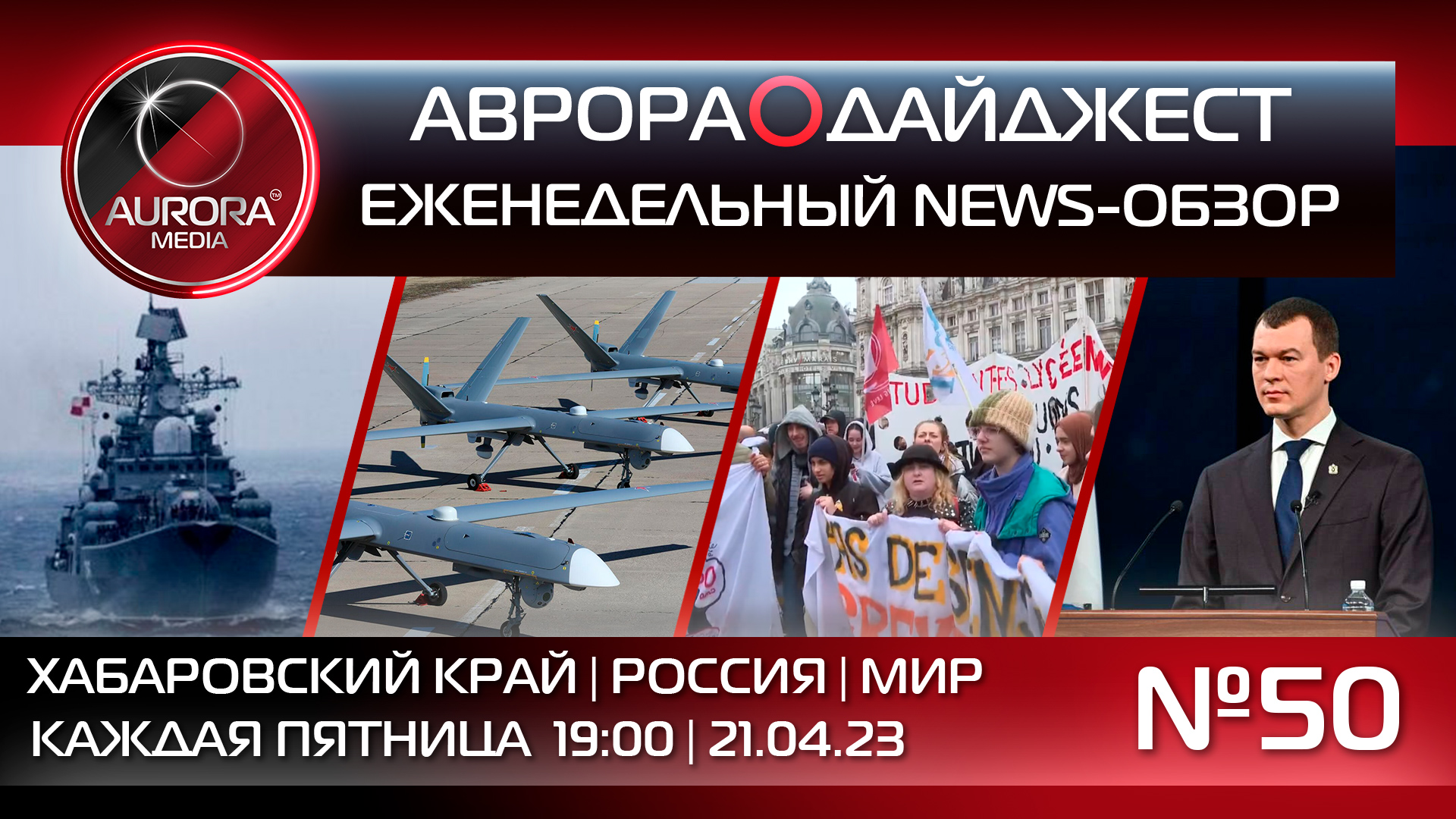 50-й еженедельный новостной видео-разбор АВРОРА⭕ДАЙДЖЕСТ, сделанный Редакцией в формате: Хабаровский край | Россия | Мир, с ключевыми региональными, российскими и международными событиями: НОВОСТИ ХАБАРОВСКОГО КРАЯ: - Губернаторский авиаколледж Комсомольска-на-Амуре стал лучшим в стране. - В Хабаровском крае стартовало онлайн-голосование за общественные территории, которые будут благоустроены в 2024 году. - Хабаровская команда «СКА-Нефтяник-2007» стала победителем всероссийских соревнований. - Первый на Дальнем Востоке крытый 50-метровый бассейн появится в Хабаровске. - Производство ударных беспилотников планируется в Хабаровске. - В Хабаровском крае готовятся к вскрытию первой в регионе скважины природного газа. - Хабаровском крае пресечена попытка организации заказного убийства. НОВОСТИ РОССИ И МИРА: - Президент России Владимир Путин посетил штаб "Днепр" на Херсонском направлении и штаб "Восток" в ЛНР.. - Владимир Путин подписал закон о создании единого реестра военнообязанных. - Украинские беспилотники нанесли удары по электроподстанциям в Белгородской области. - В Донецке под обстрел попал район Свято-Преображенского кафедрального собора. - Сергей Шойгу провел переговоры с главой военного ведомства КНР Ли Шанфу. - В России прошла внезапная проверка Тихоокеанского флота. - Южная Корея, США и Япония провели трехсторонние учения. - В Праге прошел масштабный антиправительственный митинг. - В Судане вспыхнули столкновения между регулярной армией и суданскими силами быстрого реагирования. - Конституционный совет Франции признал законной пенсионную реформу.