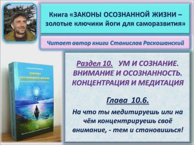 Читает автор книги Дорогие друзья! Теперь мою книгу можно не только читать, но и слушать на видеороликах! (Станислав Раскошанский. "Законы осознанной жизни - золотые ключики йоги для саморазвития". М., "Издательские решения", 2017) В этом ролике вы можете познакомиться с главой 10.6. На что ты медитируешь или на чём концентрируешь своё внимание, - тем и становишься! В данной главе освещаются законы осознанной жизни: — «НА ЧЁМ МЫ КОНЦЕНТРИРУЕМ ВНИМАНИЕ ИЛИ НА ЧТО МЕДИТИРУЕМ, ТЕМ МЫ И СТАНОВИМСЯ»; — «КОНЦЕНТРАЦИЯ ВНИМАНИЯ — КЛЮЧ УСПЕХА В ЛЮБОМ ДЕЛЕ»; — «ОДНО ДЕЛО — ЗА ОДИН РАЗ». Для практики предлагается применять следующие методики из данной главы: - ТРЕНИРОВКА КОНЦЕНТРАЦИИ ВНИМАНИЯ - УПРАЖНЕНИЕ ДЛЯ СОЗДАНИЯ ЖЕЛАЕМЫХ КАЧЕСТВ ХАРАКТЕРА - ВСЕГДА ОСОЗНАВАТЬ СЕБЯ ДУШОЙ. (Станислав Раскошанский, специалист по виньяса хатха-йоге, йогатерапии и звукотерапии, музыкант) Официальный сайт книги "Законы осознанной жизни – золотые ключики йоги для саморазвития", где её можно при обрести в печатном или электронном виде: https://ridero.ru/books/zakony_osoznannoi_zhizni_zolotye_klyuchiki_iogi_dlya_samorazvitiya/ Аудиокнига "Законы осознанной жизни – золотые ключики йоги для саморазвития" на Ютубе: https://www.youtube.com/playlist?list=PL0hBJii1rMHkFwXAtt8vm6j1HpF89Bqqu Аудиокнига "Законы осознанной жизни – золотые ключики йоги для саморазвития" на Дзен: https://dzen.ru/suite/922ef5d2-bf86-4062-b966-638c1dbf49d5 #йога #осознанность #душа #любовь #концентрация #самоанализ #медитация #внимание #яманияма