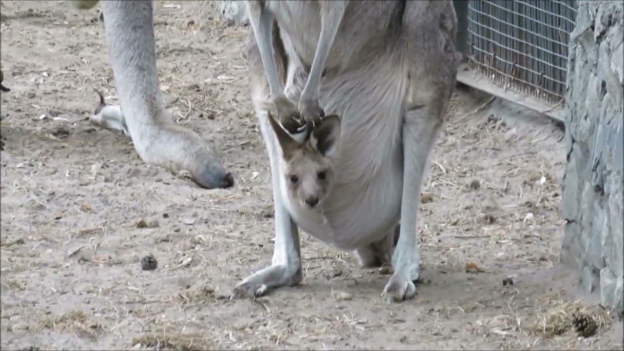 Большие серые кенгуру появились в коллекции Новосибирского зоопарка в 2008 году. Тогда из Израиля была доставлена первая пара. Позже были привезены ещё несколько больших серых кенгуру. В 2014 родился первый малыш. Вольеры кенгуру в зоопарке состоят из двух частей: тёплый павильон с выходом на улицу. Выходы на улицу им открывают ранней весной, когда ещё лежит снег, и закрывают поздней осенью. Уличные прогулки наши кенгуру продолжают вплоть до -10 градусов. Еще осенью стали заметны увеличившиеся сумки у самок больших серых кенгуру. И стало ясно, что в сумках у мам кенгуру есть малыши. С каждым месяцем сумки увеличивались, начали шевелиться, затем малыши стали показывать то хвост, то лапы, а иногда и выглядывать. Два детеныша достигли такого возраста, когда в маминой сумке еще не тесно, но уже хочется гулять самому. Один малыш впервые вышел из сумки в середине марта, другой – в начале апреля.