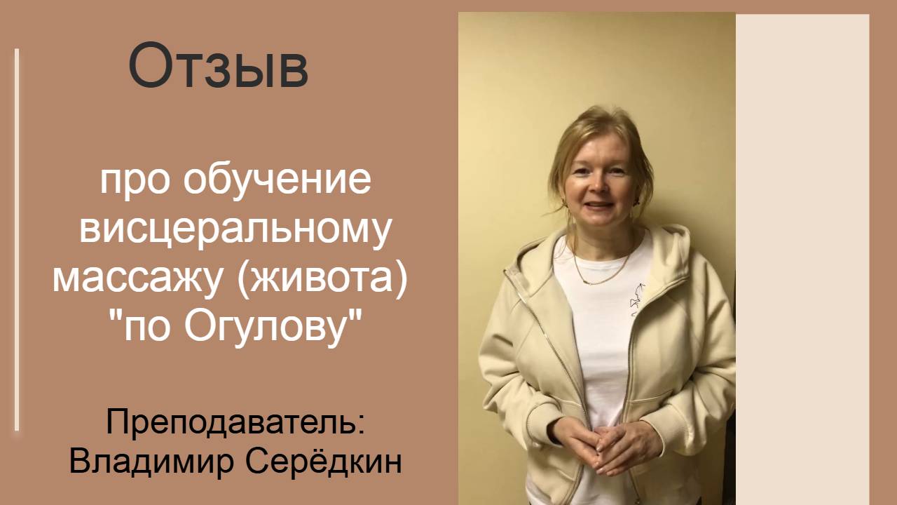 Подробно - в видео Марина “Здравствуйте, меня зовут Марина. Я посетила семинар Владимира Геннадьевича по висцеральной практике, и мне он очень понравился. Во-первых, эта тема заинтересовала меня с практической точки зрения, для заботы о собственном здоровье и здоровье моих родных и близких. Семинар дал очень много полезной информации: была и глубокая теория, и насыщенная практика. Мы опробовали технику на себе, и мне очень понравился полученный результат. Надеюсь, что теперь смогу помочь не только себе, но и своим близким и друзьям. Хочу сказать огромное спасибо! Я почерпнула для себя очень многое, особенно в практической части. С теорией было сложнее, так как я не медик, но благодаря практике все стало гораздо понятнее. Спасибо за такой полезный и интересный семинар! Буду стараться применять полученные знания.” ✅ Описание обучения бронь места на курсе висцерального массажа https://ruszdrava.ru/folkmassage ✅ Связаться с менеджером и задать вопросы про обучение на курсах: +79222160707