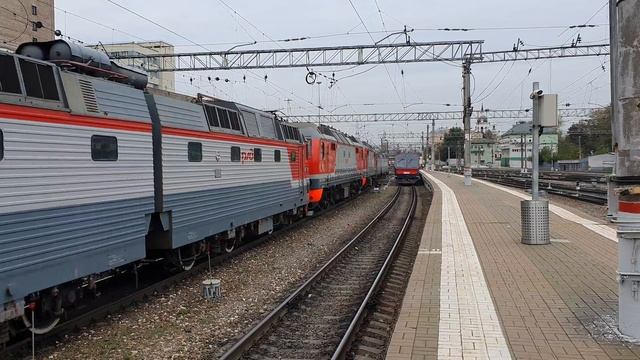 прибытие сплотки 2×ЭП20+2×ЧС7+2×ЭП2К из депо