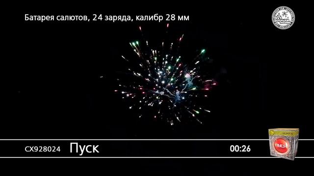 СХ928024 Пуск Батарея салютов 24 залпа высотой до 28 м калибром 1,1 дюйма, разлетом в небе до 28 м.