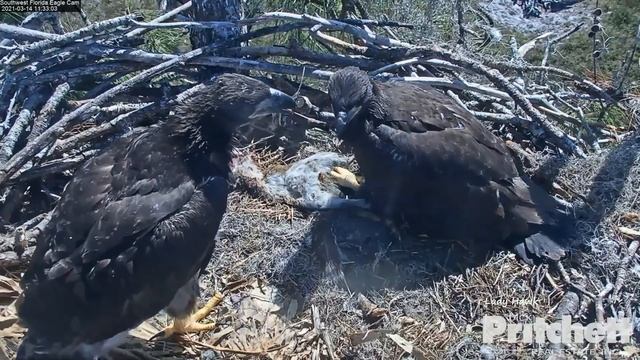 M flies in with squirrel and E18 rushes over and does a big mantle and claims it! E18 starts to work on the squirrel while Dad pulls some squirrel-ghetti out and feeds E17! E18 stands on the prey pulling & tearing while E17 is watching. Dad will head to the attic. E17 pulls out something stringy and works on that while E18 eats. Squirrel is a bit harder to eat unless fully unzipped - they both pick at the prey and then give up and hang out at the rails. Thank you for watching! Video captured & edited by Lady Hawk Thank you SWFEC , hosted by Dick Pritchett Real Estate, for allowing us the opportunity to view these amazing eagles. Link to cam: https://dickpritchettrealestate.com/