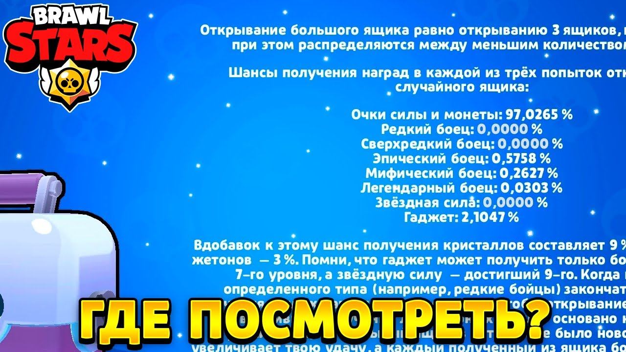 Сегодня я тебе расскажу,где посмотреть шанс на легу в бравл старс. На самом деле сейчас очень много игроков которые не знают,как посмотреть шанс на легу в бравл старс в бравл старс. В первую очередь нужно зайти в сведения о ящике - это может быть как большой ящик или мега ящик в бравл старс. Нужно зайти в сведения,и конечно же там будут показывать какие шансы выбить определённого персонажа каждой редкости. Тем самым у вас будет понимание,когда и какой персонаж будет на твоём аккаунте уже скоро. Приятного просмотра. P.s. HawK Brawl Stars. Хештеги: #бравлстарс #brawlstars #гдепосмотретьшансналегу #гдепосмотретьшанс #hawkbrawlstars Для Связи: Мой ник в БРАВЛ СТАРС ➡YT.HawK Мой клан в BRAWL STARS ➡#QLCVGJ92 Вход 14000к Я В ВК ➡ https://vk.com/id179481964 ГРУППА ВК ➡ https://vk.com/public190018983 INSTAGRAMM ➡ https://www.instagram.com/YT.HawK ИДЕЙ ДЛЯ РОЛИКА: - igorb19944@mail.ru Ссылка на донат (Будет видно на экране)➡https://www.donationalerts.com/r/hawk154 Основной контент: Игра➡Бравл Старс | Brawl stars Brawl Stars — игра для мобильных устройств в жанре MOBA, разработанная и изданная компанией Supercell. Глобальный релиз состоялся 12 декабря 2018 года. Кратко обо мне: Имя➡(Наиль) Возраст➡28 лет (День Рождения 14.04.1994) Город➡Нефтекамск (Республика Башкортостан) Мой Телефон➡ (SAMSUNG GALAXY J3) Мечта➡(Набрать Огромную Аудиторию) и всё :)