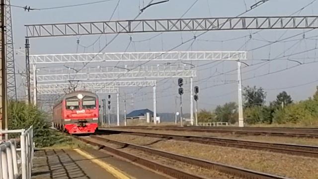 Электропоезд ЭД4М-0301 с пригородным поездом №6004 Полетаево-1 — Челябинск-Главный прибывает на 1-й путь Ст. Смолино, г. Челябинск, Челябинская обл., ЮУЖД Дата: 30.08.2022