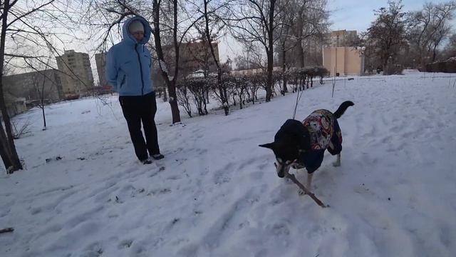 Утренняя игра с Басей в палочки на снегу в парке Аркадия.