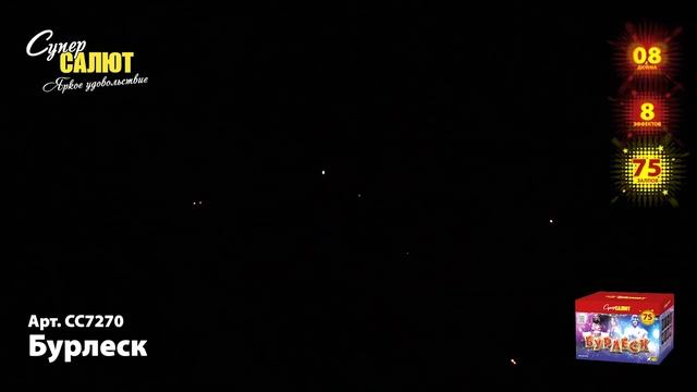 Батарея салютов Бурлеск (75/0,8) СС7270 https://spb-salut.ru/products/burlesk-75 Количество залпов/калибр: 75/0,8. Время работы до 60 сек. Высота подъема до 20 м. Эффекты: золотые волны с синими жемчужинами; серебряные кометы с белым мерцанием; золотые волны с зелёными жемчужинами и золотыми мерцающими огоньками; фиолетовые и зелёные кометы с серебряным мерцанием; золотая ива с трещащими искрами; золотые волны с рубиновым мерцанием; серебряные волны переходят в трещащие сферы; огромные серебряные хризантемы. Фасовка: 1/4. SPB SALUT - пиротехническая компания в Санкт-Петербурге. Основные направления деятельности: 1) Розничная торговля пиротехникой (офлайн магазины, интернет-магазин spb-salut.ru); 2) Организация и проведение профессиональных фейерверков; 3) Оптовая торговля пиротехникой по всей России. Адреса магазинов: 1) г. Санкт-Петербург, ул. Тележная, д. 15, лит. Б (вход с ул. Кременчугская), м. Площадь Восстания. Ежедневно с 10:00 до 22:00 2) г. Санкт-Петербург, пр. Полюстровский, д. 28Б, м. Площадь Ленина. Ежедневно с 10:00 до 22:00 Благодаря большому опыту, наши специалисты с легкостью создадут для Вас уникальное фейерверк шоу, которое сделает любой Ваш праздник незабываемым, будь то день рождение, свадьба, корпоратив или фейерверк городского масштаба! Почта: info@spb-salut.ru Сайт: https://spb-salut.ru Тел.: +7(812)242-82-24; +7(952)287-80-85.