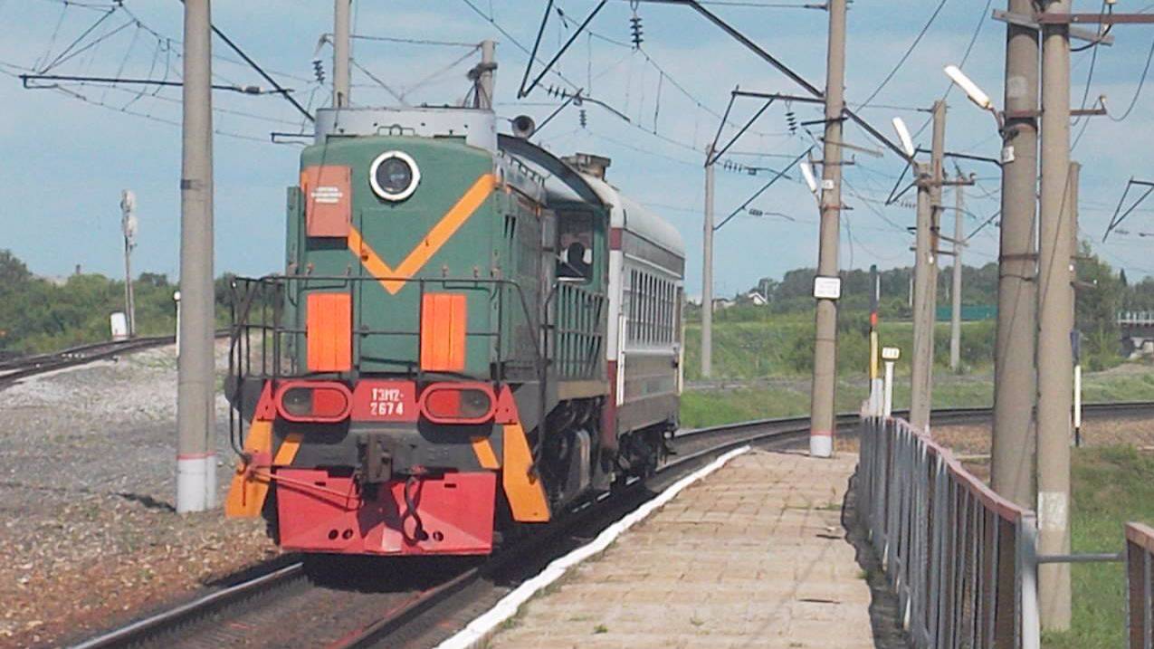 Тепловоз ТЭМ2-2674 с вагоном-путеизмерителем.