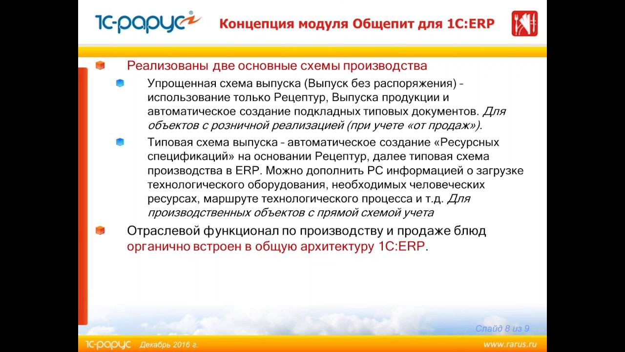 Запись вебинара от 29 декабря 2016 года «Обзор нового отраслевого продукта «Модуль 1С:Общепит для 1С:ERP»