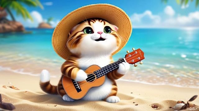 Милый кот в соломенной шляпе играет на маленькой укулеле на фоне пляжа, аниме стиль