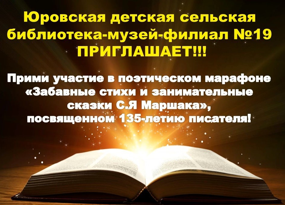 Юровская детская сельская библиотека-музей-филиал №19 ПРИГЛАШАЕТ!!! Прими участие в поэтическом марафоне «Забавные стихи и занимательные сказки С.Я. Маршака», посвященном 135-летию писателя! В Марафоне имеют право принять участие все желающие без ограничения возраста! Для участия в Марафоне необходимо подготовить и представить в детскую библиотеку видеоролик с записью декламации стихотворения Самуила Яковлевича Маршака для публикации в социальной сети Вконтакте с хэштегом #СтихиМаршака. Участником марафона может быть, как один чтец, так и коллектив чтецов. Размеры коллектива не ограничены. Требования к видеоролику: - продолжительность видеоролика не более 3 минут; - перед началом чтения должна быть озвучена следующая информация: Имя, фамилия чтеца или название коллектива. Место жительства (регион, город, или район). Я участвую в поэтическом марафоне «Забавные стихи и занимательные сказки Самуила Маршака». Название стихотворения; - стихи должны исполняться выразительно, возможно наличие в видеоролике музыкального сопровождения и элементов театрализации, но главную роль должно играть мастерство декламации; - желательным условием является присутствие в кадре (в руках чтеца, на книжной полке и т.д.) сборника стихов С.Я. Маршака; ВЗЯТЬ МОЖНО В БИБЛИОТЕКЕ! Работы принимаются с 1 по 6 ноября включительно, публикуются – по мере поступления. Участник, набравший наибольшее количество просмотров, получит ПРИЗ зрительских симпатий. Подведение итогов состоится – 30 ноября. Все участники получат символические призы. По вопросам участия обращайтесь по телефону 89189878818. Подготовлено заведующим Юровской детской сельской библиотекой-музеем-филиалом №19 А.А. Медичевой