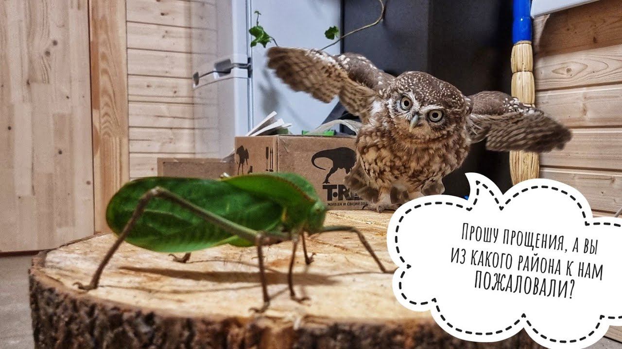 Реакция сыча Лучика на большое зелёное страшное. И это не гусеница! Гигантский кузнечик против совы