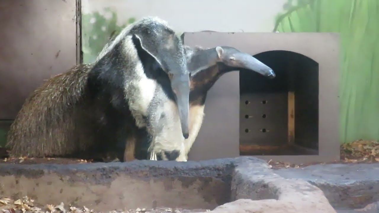 Пара гигантских муравьедов прибыла в Новосибирский зоопарк в 2020 году из зоопарка города Нюкеебинг-Морс (Дания). Наших гигантских муравьедов зовут Калле и Майя. Пара была сформирована несколько лет назад, у них уже рождались детеныши. 11 марта 2022 года родился детеныш краснокнижного гигантского муравьеда у нас в зоопарке. Их купают под душем в соседней комнате. Гигантский муравьед — самое крупное животное в отряде неполнозубых, длина его тела составляет 110-130 см. У него нет зубов, а язык достигает в длину 60 см — он нужен муравьеду для добычи корма. Животное разрушает термитники и муравейники, и языком, смоченным липкой слюной, быстро собирает насекомых. Кормят муравьеда однородной смесью фруктов, геркулеса, личинок насекомых, собачьего корма, торфа и других компонентов. Спит до 16 часов в сутки. Ходить по земле, имея такие длинные когти, трудно, и муравьеды вынуждены подгибать когти и опираться на тыльную сторону передних лап. Когтями легко защищается от врагов — одним ударом лапы большой муравьед способен выпотрошить собаку или даже убить человека и ягуара. В неволе живут до 14 лет. Самки муравьеда носят на спине единственного детёныша и не расстаются с ним от рождения до следующей беременности. Благодаря окраске, схожей с материнской, детёныш почти незаметен. Половозрелыми становятся через 2,5—4 года.