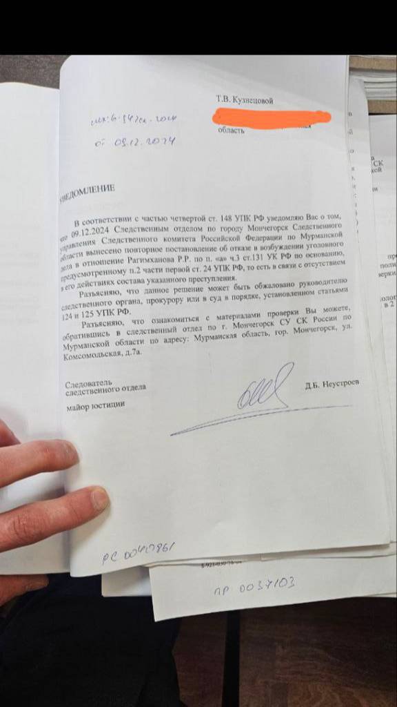 Приезжий из Дагестана надругался над девочкой – сестрой воина СВО. Все улики есть, но в возбуждении дела следователи отказывают! https://t.me/CROW_CROW_RU/6134 Осенью 2024 года в комнату студентки общежития Мончегорска ворвался уроженец республики Дагестан Расул Рагимханов. Он вскрыл дверь, напал на девочку, скрутил её и изнасиловал. Девочка не была знакома с негодяем, хотя несколько раз видела его лицо. Сразу после произошедшего она позвала на помощь социального работника колледжа и передала окровавленное постельное бельё в качестве улики. Девушка надеялась, что его приобщат к делу, равно как и записи с камер видеонаблюдения. Возмущённая родня подала заявление в полицию. Но сразу же, по словам родственников, начались какие-то странности, а именно: - при допросе девушка просила предоставить психолога, но ей отказали в грубой форме. Сам же допрос проходил с нарушениями; - у Расула Рагимханова внезапно появилось алиби. А полную версию записей с камер наблюдения следствие отказывалось показывать на всех этапах дела; - постельное бельё девушки, которое было передано социальному работнику, куда-то пропало. Более того, в деле появились фотографии чистого постельного белья; - опознание не проводилось, хотя потерпевшая сторона узнала виновника по фотографии на сайте колледжа; - из учащихся колледжа были допрошены только удобные люди для стороны обвинения. И это далеко не все нарушения, выявленные роднёй девушки. А сам насильник не только обесчестил невинную девочку, но и заразил её. Анализы это подтверждают – пострадавшая до сих пор проходит лечение и уже похудела на 18 килограмм на фоне нервного срыва. Хуже того, старший брат Расула, который «держит» общежитие, откуда-то узнал о телефонах и адресах всех членов семьи девочки – братьев, сестры, мамы. И это произошло сразу после того, как следователь закрыл дело «в связи с отсутствием состава преступления». Брат потерпевшей логично задаётся вопросом, неужели связь диаспор с местными силовиками достигла такого уровня, что некоторые из них готовы покрывать преступления? Ну и «вишенка на торте». После того, как пострадавшую и её семью взяла под защиту Русская Община, в новостях региона появилась информация, что следователь по данному делу внезапно отбыл на СВО. Совпадение или нет? Оставим ответы на эти вопросы компетентным органам.