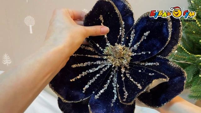 333042 Цветок декоративный Магнолия с велюровым покрытием и золотистыми пайетками темно-синий 50см