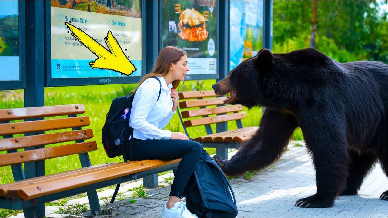 Медведь бесшумно приближается к этой женщине на автобусной остановке, и, поняв причину, она следует