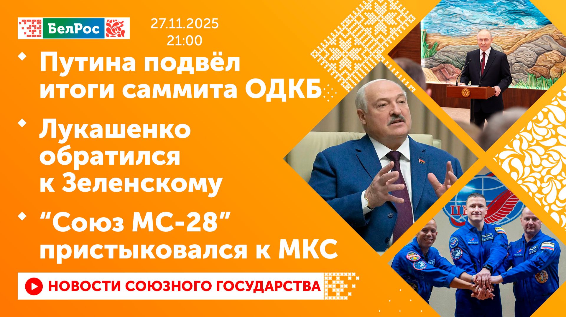 Закадровый текст озвучивает *ИИ Антон* Новости 27.11.2025 на 21:00 - Владимир Путин подвёл итоги визита в Киргизию и саммита ОДКБ. - Президент России ответил на вопросы журналистов о боевых действиях на Украине. - Путин указал на необходимость детального обсуждения мирного соглашения по Украине. - Владимир Путин: конфискация российских активов резко снизит доверие к еврозоне. - Александр Лукашенко прокомментировал мирный план США по Украине. - Президент Беларуси заявил, что страны Европы не хотят достижения мира на Украине. - Лукашенко обратился к Зеленскому. - Александр Лукашенко: Беларусь отправляла топливо Киргизии при согласовании с Россией. - Пилотируемый корабль "Союз МС-28" пристыковался к МКС. Смотрите главные новости Союзного государства на телеканале БелРос. Ссылки на наши соц. сети Сайт: http://belros.tv/ Telegram: https://t.me/belrostv Одноклассники: https://ok.ru/group/55657426976918 ВКонтакте: https://vk.com/belrostv TikTok: https://www.tiktok.com/@belros_tv?_t=... RuTube: https://rutube.ru/channel/23501830/ Яндекс. Дзен: https://zen.yandex.ru/belrostvv Наши подкасты на Яндекс. Музыке: https://music.yandex.ru/album/25615251 #главныеновости #новостисегодня #СоюзноеГосударство