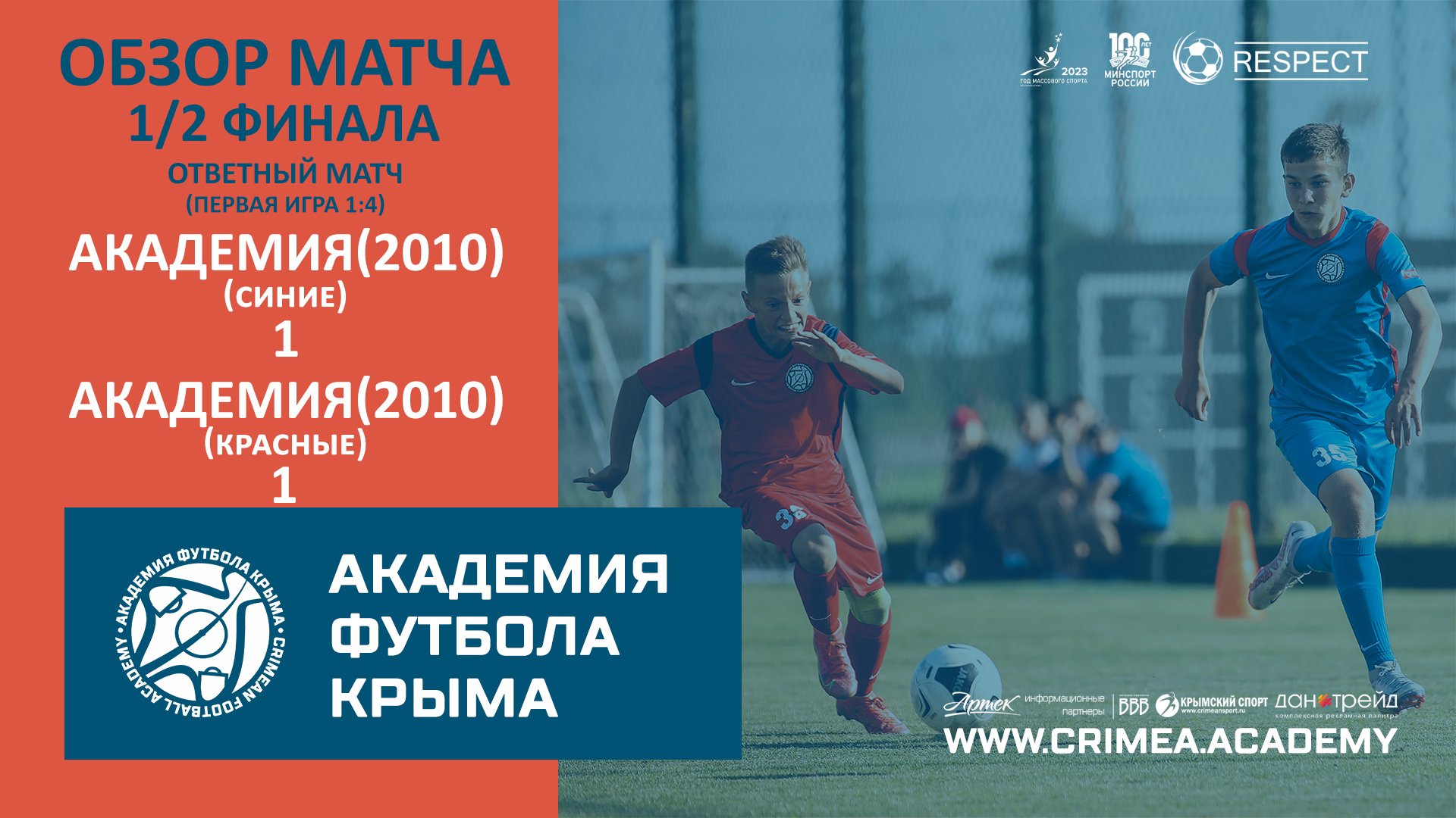 Обзор ответного полуфинала Открытого первенства детско-юношеской футбольной лиги Крыма среди юношей 2010 г.р. (2022/2023): Академия футбола Крыма (2010)-синие - Академия футбола Крыма (2010)-красные. (Первый матч - 1:4) Наш сайт: https://www.crimea.academy/ Академия футбола Крыма – это большая футбольная семья, которая открыта для общественности и готова к взаимному сотрудничеству, обмену опытом и профессиональному общению. Наша цель – подготовка качественных и конкурентоспособных футболистов с учетом современных требований, а также образованных и всесторонне развитых членов современного общества. Наша приоритетная задача – отбор детей, проявивших выдающиеся способности в области футбола для совершенствования их спортивного мастерства. Команды Академии ориентированы на атакующий и зрелищный футбол, в котором удовольствие получает не только сам игрок, но и зритель. При этом интересы команды не должны идти в ущерб задаче воспитания отдельного футболиста. В основе воспитания юных футболистов в нашей Академии лежит принцип – "подготовка игрока, а не команды". #футбол #спорт #СвернёмГоры #football #soccer #sport