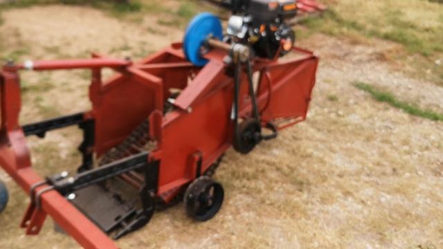 Демонстрируется работа приводной от ДВС картофелекопалки для минитрактора.