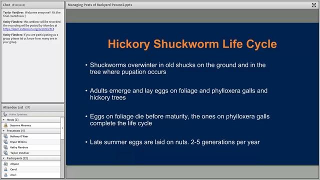 Thousands of mature pecan trees are grown around homes, many with sparse and erratic production. Usually, there is no single reason why a pecan tree fails to produce a crop or produces poor quality nuts. Learn practical tips about pecan pests and pecan management by Bryan Wilkins, Research Associate IIl, Gulf Coast Research and Extension Center. Part of the 2016 All Bugs Good and Bad Webinar Series. The webinars are brought to you by the following eXtension Communities of Practice: Imported Fire Ants, and Urban IPM; and by the Alabama Cooperative Extension System, the Texas A&M AgriLife Extension Service, Clemson Cooperative Extension and the University of Georgia Center for Urban Agriculture.