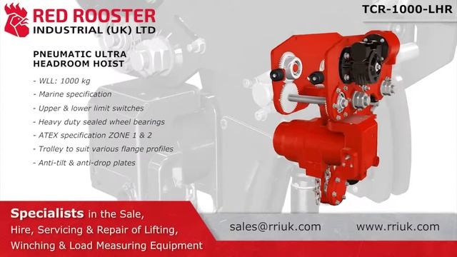 The TCR-1000-LHR is a 1 tonne model from Red Rooster Industrial UK's low headroom pneumatic chain hoists range with trolley.