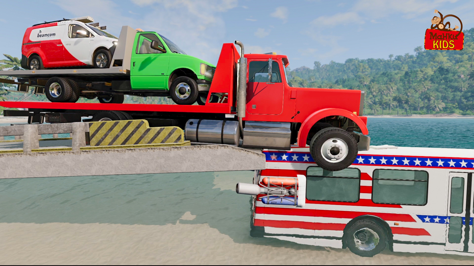 Машинам надо перебраться на другой берег, но только автобус может ехать по такой глубокой воде. Автобус может перевезти машины на своей крыше, но все машины не смогут уместиться на крыше автобуса. Поэтому машины решили построить машину из пирамид, чтобы проехать через воду.