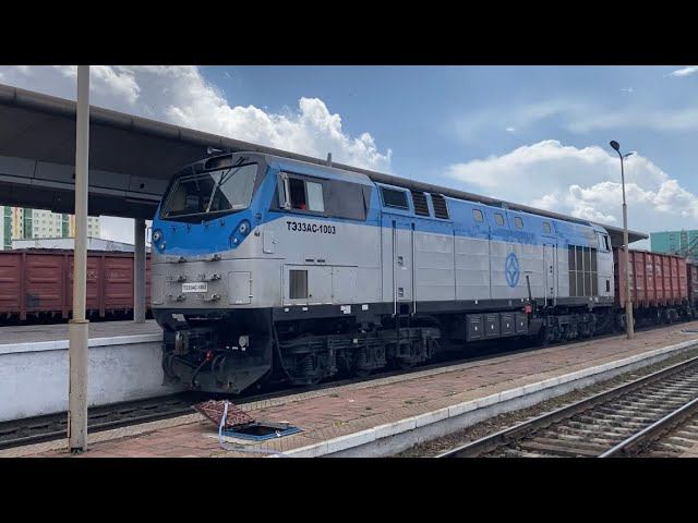 ТЭ33АС-1003 монгольских железных дорог проносится по станции Улан-Батор с составом полувагонов