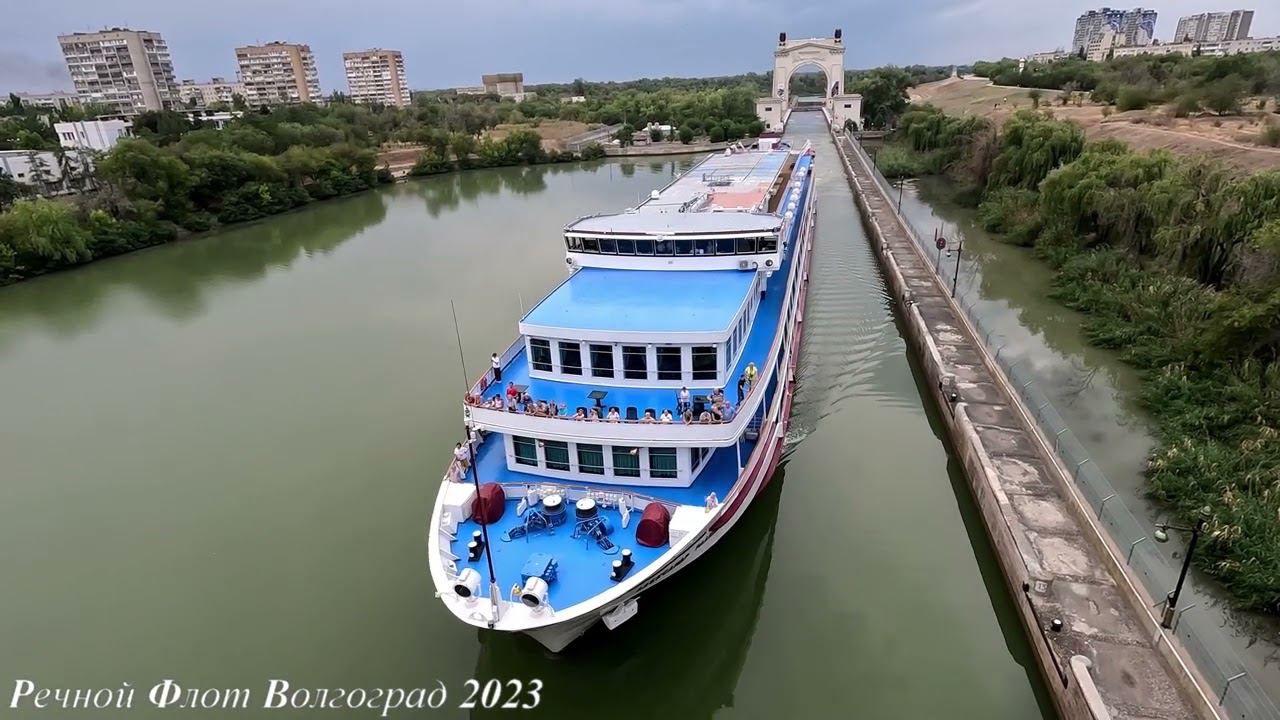 Пассажирский теплоход Александр Радищев выходит из шлюза №1 ВДСК
