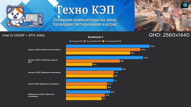 Сборки от ТЕХНО КЭП! — https://techno-cap.ru/ Конфигурация компьютера AetherPulse (данный игровой ПК имеется в наличии и готов к отправке) https://techno-cap.ru/product/aetherpulse-velikolepnyj-igrovoj-pk-rtx-4060/ — Процессор: Intel Core i3-12100F — Материнская плата: MSI PRO H610M-E DDR4 — Оперативная память: G.Skill AEGIS 16 ГБ DDR4 — Видеокарта: Inno3D GeForce RTX 4060 TWIN X2 — Башенный вентилятор с 4 теплотрубками — SSD 1: под windows: 120 Гб HP S700 — SSD 2: ARDOR GAMING Ally AL1284 512 Гб NVMe M2 — скоростной SSD под игры — Блок питания: AeroCool VX PLUS 650W [VX-650 PLUS] — Корпус: Ginzzu SL190 (акриловое стекло, передняя панель закаленное стекло) — Операционная система: Windows 11 LTSC 24H2 Сборки достаточно для комфортной игры на высоких настройках графики в FULL HD (1920x1080), в не требовательных играх. Тесты в 39 играх можно найти на официальном сайте сборки https://techno-cap.ru/product/aetherpulse-velikolepnyj-igrovoj-pk-rtx-4060/. Полностью все тесты сборки можно посмотреть программой CapFrameX (на английском языке), в программе можно увидеть статтеры, загруженность cpu и gpu и многое-многое другое. Данная программа является на сегодняшний день лучшей для анализа, тестирования и мониторинга в играх. Ссылка на архив с программой и тестами: https://disk.yandex.ru/d/VTe3gVJRrLXtIg Чтобы увидеть все тесты, нужно в разделе "root capture folder" (слева), указать путь к разархивированной папке ...\CapFrameX_beta_1.7.5_portable\CapFrameX Как пользоваться программой разберётесь почитав инфу на официальном сайте разработчика: https://www.capframex.com/features #nvidia #rtx #rtx4060 #test #pc #4060 #intel #12100 #H610M #fps #gaming #computer #test #gamingchannel #pcgaming #pcbuild #testing #technology #intelgaming #amdgameplay #computer #compshop #техника #тест #фпс #тестирование #игры #пк #пкдляигр #сборка_компьютера #сборкапк Результаты тестов в Full HD на ВЫСОКИХ настройках графики с DLSS КАЧЕСТВО, DLSS качество + генератор кадров FSR/XeSS.. при доступности (Максимально высокий FPS, который можно получить в данной сборке на ВЫСОКИХ настройках графики): Alan Wake 2 — 110 FPS Atomic Heart — 149 FPS Baldur's Gate 3 — 209 FPS Black Myth Wukong — 90 FPS Borderlands 3 — 173 FPS Borderlands 4 — 102 FPS Borderlands GOTY Enhanced — 325 FPS Clair Obscur: Expedition 33 — 117 FPS Cyberpunk 2077 — 172 FPS Days Gone — 161 FPS Dead Island 2 — 165 FPS Doom: The Dark Ages — 133 FPS Dying Light 2 — 113 FPS Dying Light The Beast — 128 FPS Final Fantasy XVI — 135 FPS Forza Horizon 5 — 206 FPS Ghost Of Tsushima — 154 FPS God of War: Ragnarök — 163 FPS Grand Theft Auto V Enhanced — 254 FPS Hogwarts Legacy — 147 FPS Kingdom Come: Deliverance II — 164 FPS Lies of P — 249 FPS Marvel's Spider-Man 2 — 139 FPS Mirrors Edge Catalyst — 199 FPS Naraka Bladepoint — 152 FPS Need for Speed: Payback — 244 FPS Once Human — 144 FPS PUBG: Battlegrounds — 159 FPS Red Dead Redemption 2 — 183 FPS RoboCop Rogue City — 128 FPS Shadow of the Tomb Raider — 222 FPS SILENT HILL 2 — 102 FPS STAR WARS Jedi: Survivor — 111 FPS The Elder Scrolls IV: Oblivion Remastered (2025) — 115 FPS The Last of Us Part II — 139 FPS The Witcher 3: Wild Hunt — 189 FPS Tom Clancy's The Division — 208 FPS Uncharted: Legacy of Thieves Collection — 212 FPS Warcraft III Reforged — 297 FPS Watch Dogs 2 — 160 FPS Watch Dogs: Legion — 93 FPS