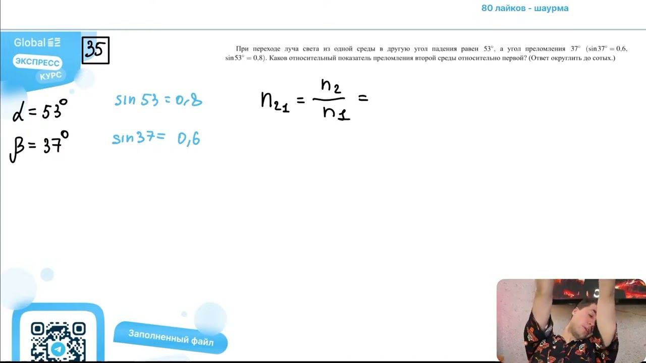 При переходе луча света из одной среды в другую угол падения равен 53°, а угол преломления - №28383