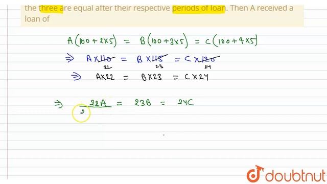 A sum of Rs, 7,930 is divided into three parts and given on loan at 5% simple interset to A, B and C for 2,3 and 4 years respectively. If the amounts of all the three are equal after their respective periods of loan. Then A received a loan of Class: 14 Subject: MATHS Chapter: SIMPLE INTERSET Board:GOVT You can ask any doubt from class 6-12, JEE, NEET, Teaching, SSC, Defense and Banking exam on Doubtnut App or You can Whatsapp us at - 8400400400 Link - https://doubtnut.app.link/2um0jr7Joeb Join our courses to improve your performance and Clear your concepts from basic for Class 6-12 School and Competitive exams (JEE/NEET) - https://doubtnut.app.link/POyZDvv5Lyb Contact Us: 👉 Have Any Query? Ask Us. 🤙 Call: 01247158250 💬 WhatsApp: 8400400400 📧 Email: info@doubtnut.com 🌐 Website: https://www.doubtnut.com Welcome to Doubtnut. Doubtnut is World’s Biggest Platform for Video Solutions of Physics, Chemistry, Maths and Biology Doubts with over 5 million+ Video Solutions. Doubtnut is a Q&A App for Maths, Physics, Chemistry and Biology (up to JEE Advanced and NEET Level), Where You Can Ask Unlimited Questions by Clicking a Picture of Doubt on the Doubtnut App and Get Instant Video Solution. Subscribe Our YouTube Channels: ✿ Doubtnut: https://www.youtube.com/channel/UCcv7pspGHmM7AOywuLM1ufA?sub_confirmation=1 ✿ Class 11-12, JEE & NEET (Hindi): https://www.youtube.com/channel/UCiIrZf4bn1i0IOf8YgSMzWA?sub_confirmation=1 ✿ Class 11-12, JEE & NEET (English):: https://www.youtube.com/channel/UCbJ_xe2bMLo9yuBC-i_13MQ?sub_confirmation=1 ✿ Class 6-10 (Hindi): https://www.youtube.com/channel/UCZnV1hkn5A3fdpTOVi60tzg?sub_confirmation=1 ✿ Class 6-10 (English): https://www.youtube.com/channel/UC9KeHSWOEBXIrbWYasHeSyg?sub_confirmation=1 ✿ Doubtnut Govt. Exams: https://www.youtube.com/channel/UCWPaROsU_06MSqiZ_O6zaVg?sub_confirmation=1 Follow Us: 🔔 Facebook: https://www.facebook.com/doubtnut 🔔 Instagram: https://www.instagram.com/doubtnut 🔔 Telegram: https://t.me/DoubtnutOfficial 🔔 Twitter: https://twitter.com/DoubtnutApp 🔔 LinkedIn: https://www.linkedin.com/company/doubtnut Our Telegram Pages: 🔔 Doubtnut Official: https://t.me/DoubtnutOfficial 🔔 Doubtnut IIT JEE: https://t.me/DoubtnutIITJEE 🔔 Doubtnut NEET: https://t.me/Doubtnut_NEET 🔔 Doubtnut CBSE Boards: https://t.me/DoubtnutCBSEBoards 🔔 Doubtnut UP Boards: https://t.me/DoubtnutUPBoards 🔔 Doubtnut Bihar Boards: https://t.me/DoubtnutBiharBoards 🔔 Doubtnut Government Exams: https://t.me/DoubtnutGovernmentExams class 14 class 14 physics class 14 chemistry class 14 english class 14 maths class 14 biology cbse class 14 result class 14 economics class 14 accountancy class 14 syllabus physics cbse class 14 class 14 english grammar class 14 syllabus cbse class 14 history class 14 geography class 14 ncert class 14 syllabus cbse class 14 maths cbse class 14 english cbse class 14 physics cbse class 14 chemistry class 14 grammar cbse class 14 biology cbse class 14 commerce cbse class 14 accountancy class 14 syllabus chemistry class 14 grammar syllabus class 14 syllabus maths class 14 latest syllabus class 14 syllabus english class 14 syllabus biology class 14 syllabus of physics class 14 syllabus of chemistry class 14 syllabus science class 14 syllabus ncert class 14 syllabus of english class 14 syllabus commerce