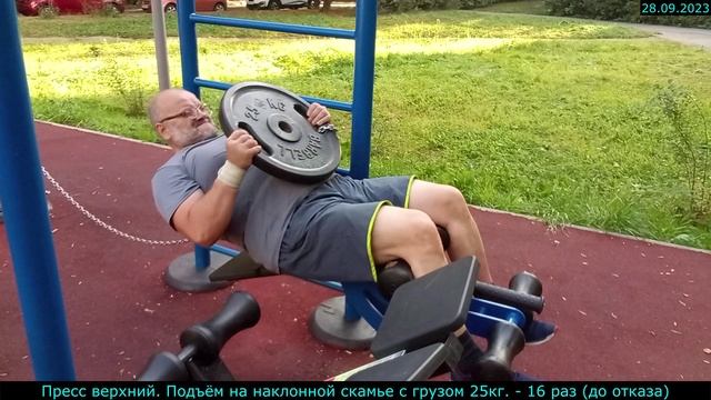 28.09.2023 - Пресс верхний. Подъём на наклонной скамье с грузом 25кг. - 16 раз (до отказа)