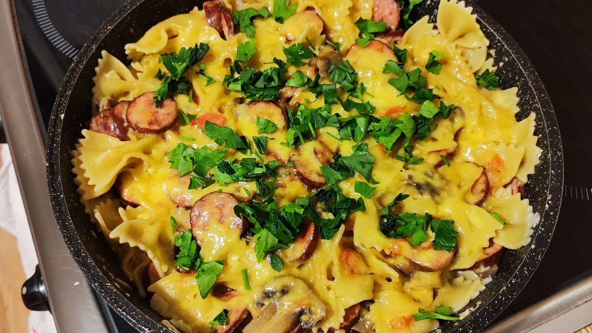 Что-то новенькое, ребята, поющий повар. Если зайдёт такой контент, то будем развиваться в этом направлении. Голосуйте в комментариях какую песню исполнить следующей, а блюдо уже от меня. Я - меломан, очень люблю петь, пою везде - на кухне, в машине, в душе, на работе, репертуар у меня большой от шансона до попсы. Естественно в разумных пределах, какого-нибудь Монгенштерна не предлагать. Готовить я тоже люблю, стараюсь готовить что-то разнообразное и интересное. Парни, хотите порадовать свою вторую половинку вкусным, сытным, а главное простым блюдом? Ниже привожу рецепт приготовления вкусной немецкой пасты Список ингредиентов: Лук - 1 шт., Грибы - 200 гр., Колбаса копчëная - 450 гр., 3 зубчика чеснока, Лапша - 250 гр., Помидор - 2 шт., Куриный бульон - 450 мл., Сливки - 120 мл., Соль, чëрный перец, орегано, Сыр - 120 гр. (нужно Чеддер, но я использовал Российский), Петрушка. Последовательность приготовления: -Нарезаем лук кубиками, наливаем в сковородку 2 столовые ложки растительного масла, обжариваем лук 1 минуту; -Грибы (я использую шампиньоны) нарезаем пластинками, добавляем к луку и обжариваем 2 минуты перемешивая; -Колбасу нарезаем круглишками, добавляем в сковородку, обжариваем 2 минуты; -Чеснок мелко режем, добавляем в сковородку, перемешиваем, жарим 30 секунд; -Помидоры нарезаем кубиками, отправляем в сковородку, туда же высыпаем макароны (я использую бабочки), выливаем сливки и горячий куриный бульон; -Бульон я готовлю заранее, кусок филинного куре варю примерно в 500 мл. воды около 30 минут; -Далее добавляем соль, перец, орегано, всë перемешиваем и варим под крышкой 15 минут; -Сыр трëм на крупной тëрке, добавляем в блюдо, не перемешивая, накрываем крышкой и варим ещë 5 минут; -Когда блюдо готово можно посыпать мелконарезанной петрушкой и подавать к столу. Готово, всем приятного аппетита! Чтобы не теряться добавляйтесь везде: наш телеграм: t.me/kot124rus запрещеграм Вики: bratenkovaviktoriia мой запрещеграм: kot_881988 наш бусти: https://boosty.to/kot1988 наш ютуб: https://youtube.com/@kot124?si=HKC6iJlZ5gV8Kuel Если хотите поддержать канал: ВТБ 2200 2407 4228 8828 СберБанк 5336 6901 2942 1261 АльфаБанк 2200 1523 3221 3373