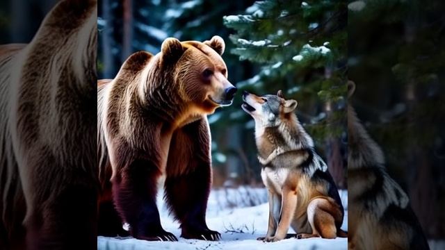 огромный бурый медведь в зимнем сосновом лесу разговаривает с серым волком