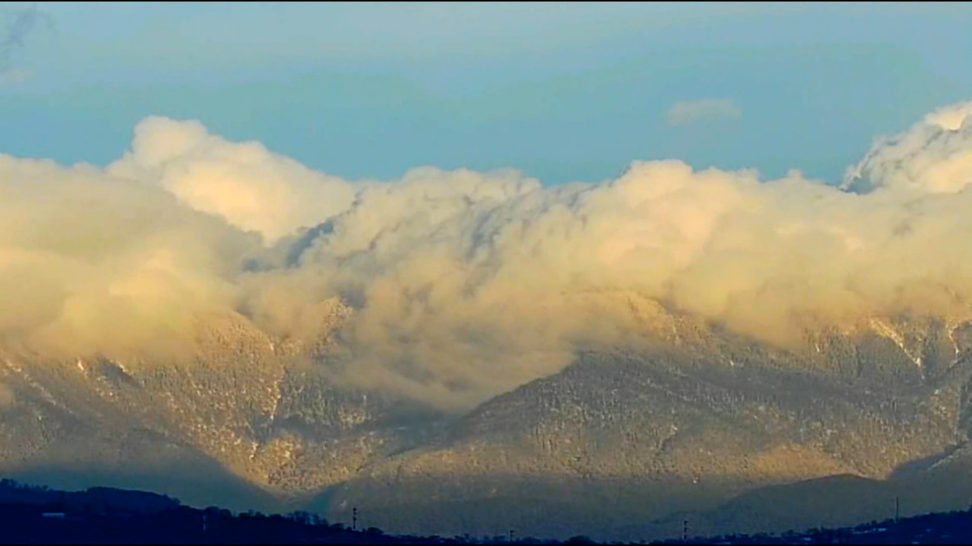 Облака в закатных лучах в заснеженных горах над Адлером 23.12.2023