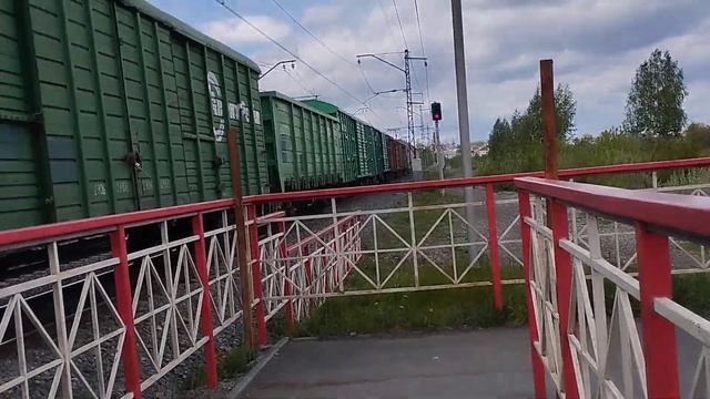 "2ЭС6-939" с грузовым поездом следует через ЖД переход.