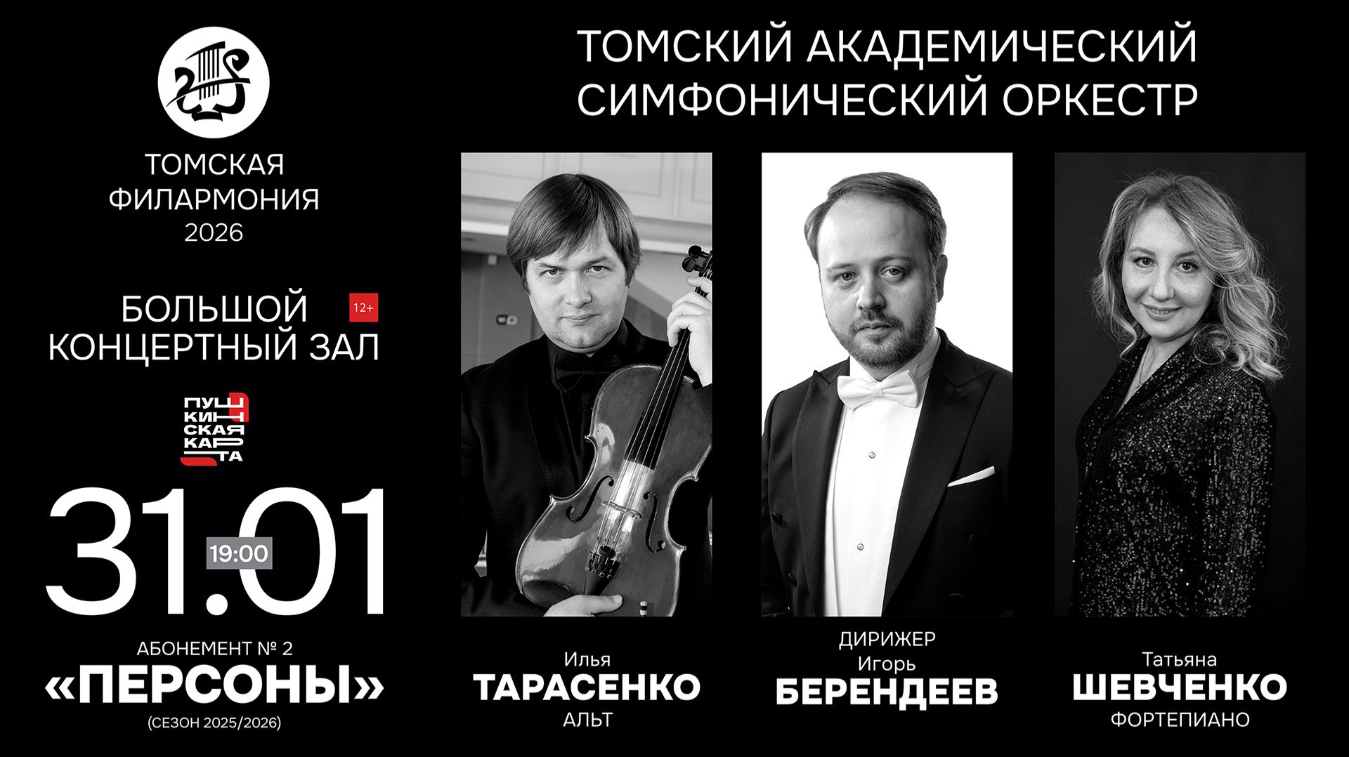 В последний день января героями филармонического абонемента «Персоны» станут пять ярких личностей – исполнители и композиторы, каждый из которых по-своему раскрывает музыкальное содержание эпохи. Томский академический симфонический оркестр под управлением главного дирижёра Игоря Берендеева впервые исполнит «Этюды в простых тонах» Александра Чайковского и Концерт для оркестра Белы Бартока. «Этюды в простых тонах» – концерт для альта и фортепиано с оркестром, созданный в 1992 году и получивший международное признание. Произведение многократно и с большим успехом звучало в исполнении автора и Юрия Башмета. В Томске его представят солисты Новосибирской филармонии Илья Тарасенко (альт) и Татьяна Шевченко (фортепиано). Концерт для оркестра Бартока – пятичастное сочинение, по сути симфония, написанная для большого оркестра в традиции concerto grosso. Композитор насыщает партитуру виртуозными соло, ансамблевыми диалогами и тембровой полифонией. Созданная в годы Второй мировой войны по заказу Бостонского оркестра, музыка соединяет драматизм, иронию и напряжённые переживания, завершаясь мощным, жизнеутверждающим апофеозом танца. Исполнители: ТОМСКИЙ АКАДЕМИЧЕСКИЙ СИМФОНИЧЕСКИЙ ОРКЕСТР Дирижер – Игорь БЕРЕНДЕЕВ Илья ТАРАСЕНКО (альт, Новосибирск) Татьяна ШЕВЧЕНКО (фортепиано, Новосибирск) В программе: Чайковский. Концерт для альта и фортепиано с оркестром № 2 «Этюды в простых тонах» Барток. Концерт для оркестра