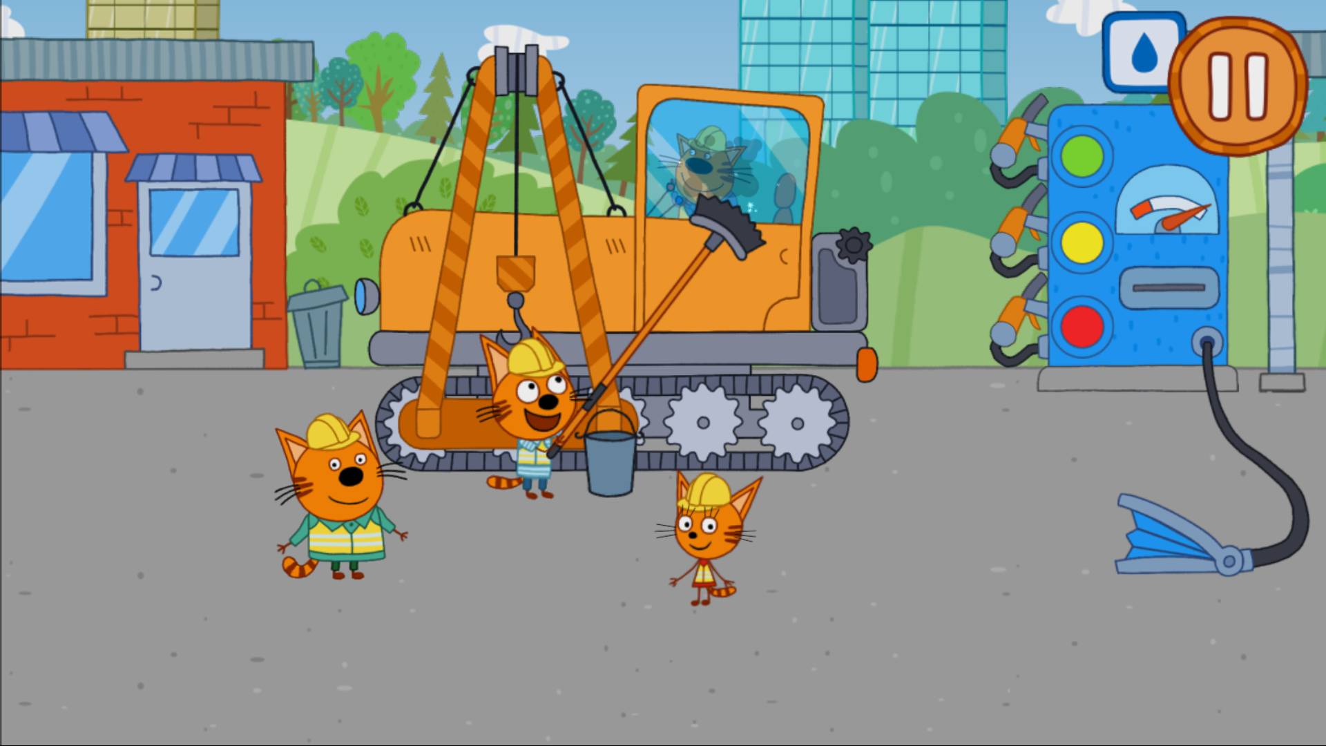 Три кота работают на стойке и собирают оранжевую машину